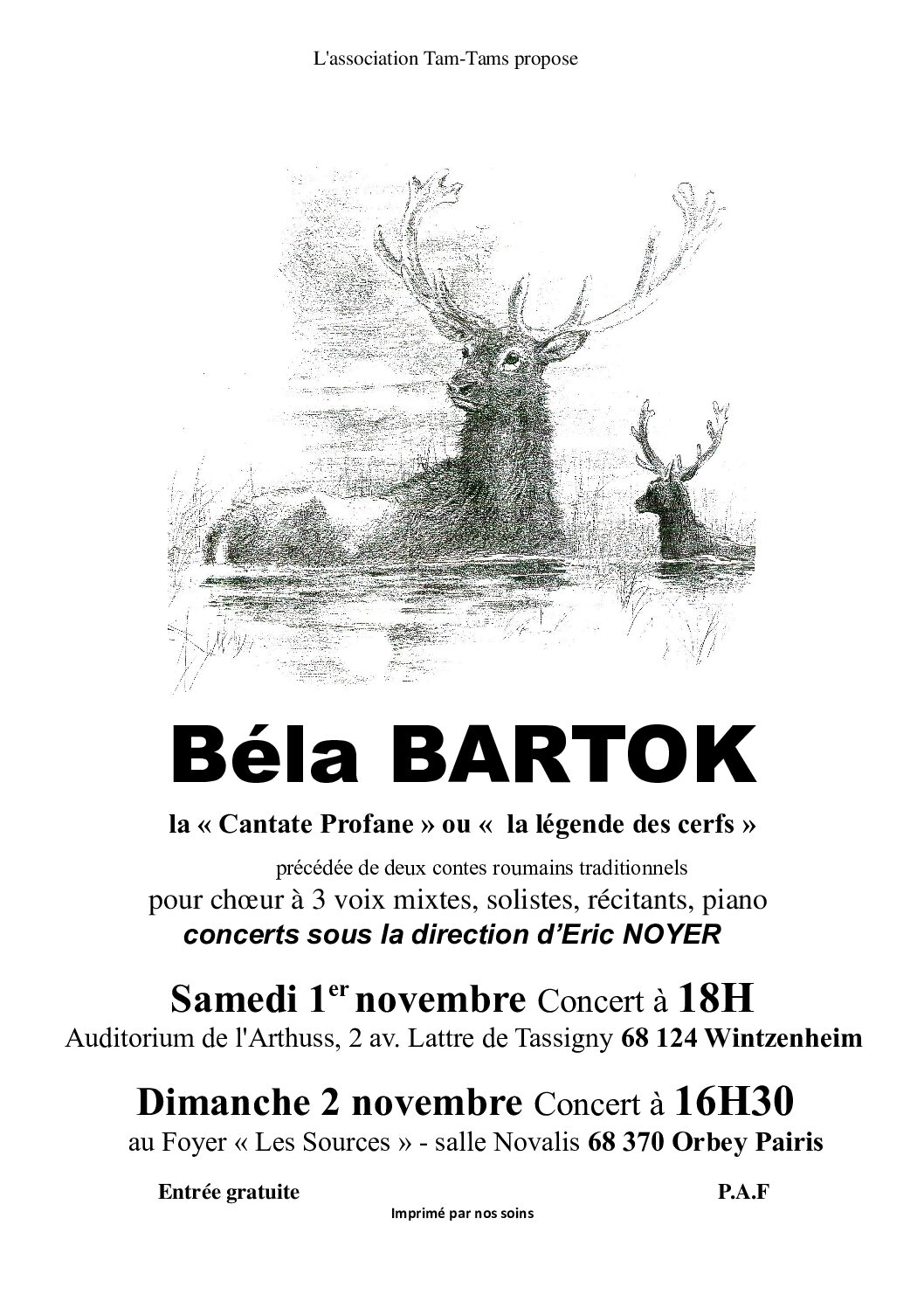 Venez découvrir la « Cantate Profane » ou « la légende des cerfs » précédée de deux contes roumains traditionnels pour choeur à 3 voix mixtes, solistes, récitants, piano - concerts sous la direction d’Eric NOYER.